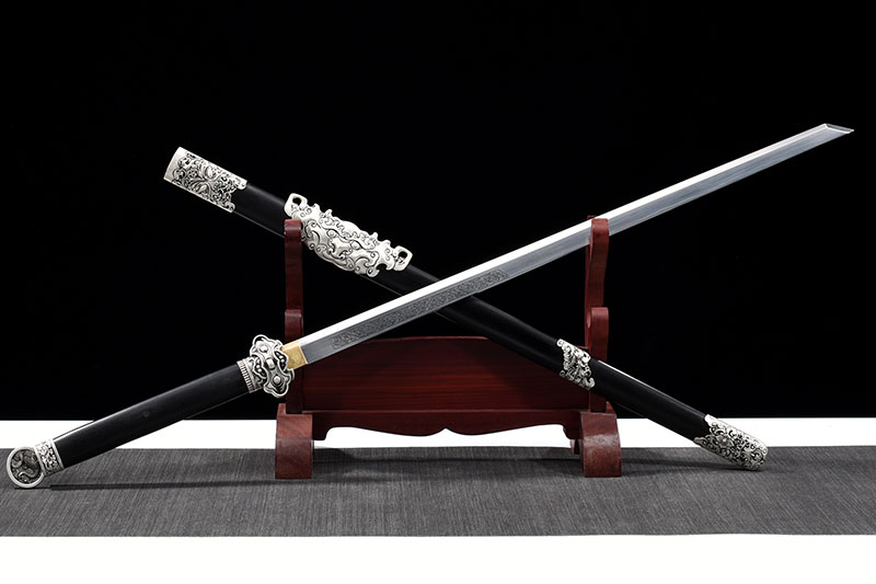 28寸大夏龍雀刀身長75CM 唐刀刀身,花紋鋼拋光磨口酸洗洗花,快口可砍鐵,正面爛纏枝紋 銀白鋅合金配件 唐刀刀夾 黑木 木柄25CM,劍身3.2CM 紅龍布木盒