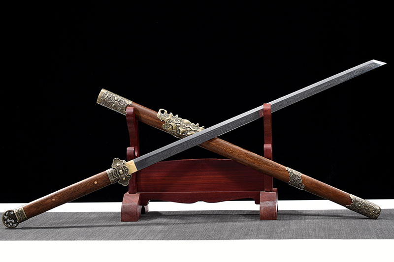 28寸大夏龍雀刀身長(zhǎng)75CM 唐刀刀身,花紋鋼拋光磨口酸洗洗花,快口可砍鐵,正面爛纏枝紋 鋅合金配件青古銅 唐刀刀夾 黑木 木柄25CM,劍身3.2CM 紅龍布木盒