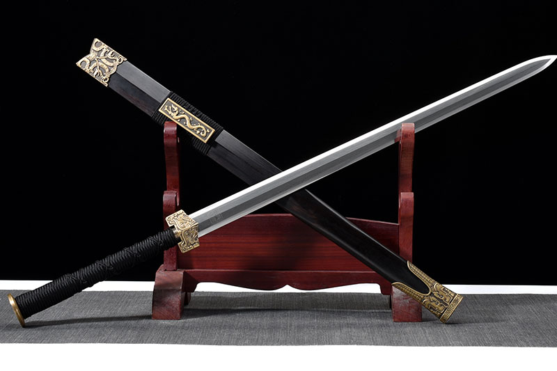 20寸漢武劍 花紋鋼無槽八面拋光磨快口劍身爛龍泉鄭氏方章 壓鑄銅配件作舊 黑檀木殼 柄繞紅黑蠟繩 麻木錦盒 帶真絲刀帶 收藏證書 5折小冊 小瓶刀油 白手套 保養(yǎng)卡