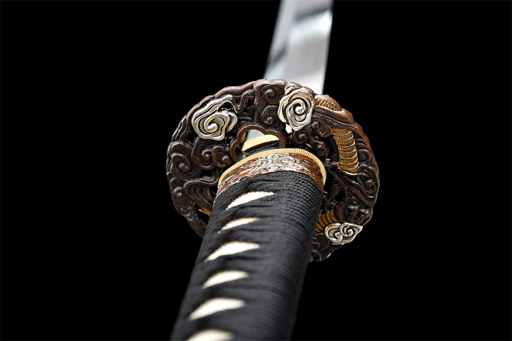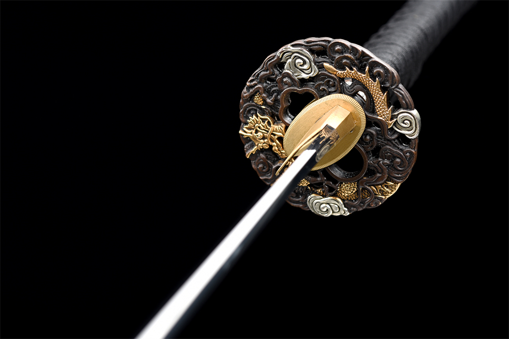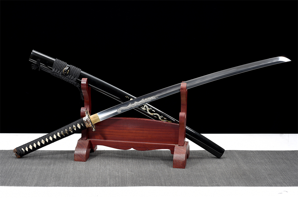 鞘材:實木黑色亮光漆 鑲嵌貝殼單龍圖三個黑牛角,繞黑色真絲帶