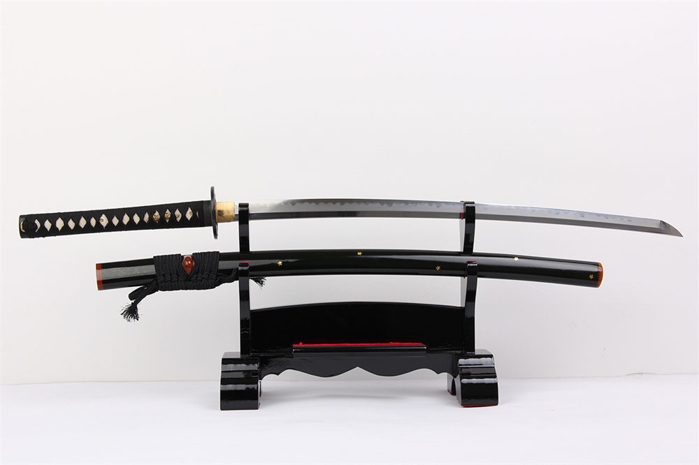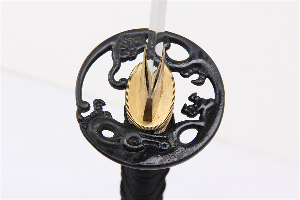 鞘材:實(shí)木黑亮光漆貼銅花三個黃牛角 繞黑色真絲帶
