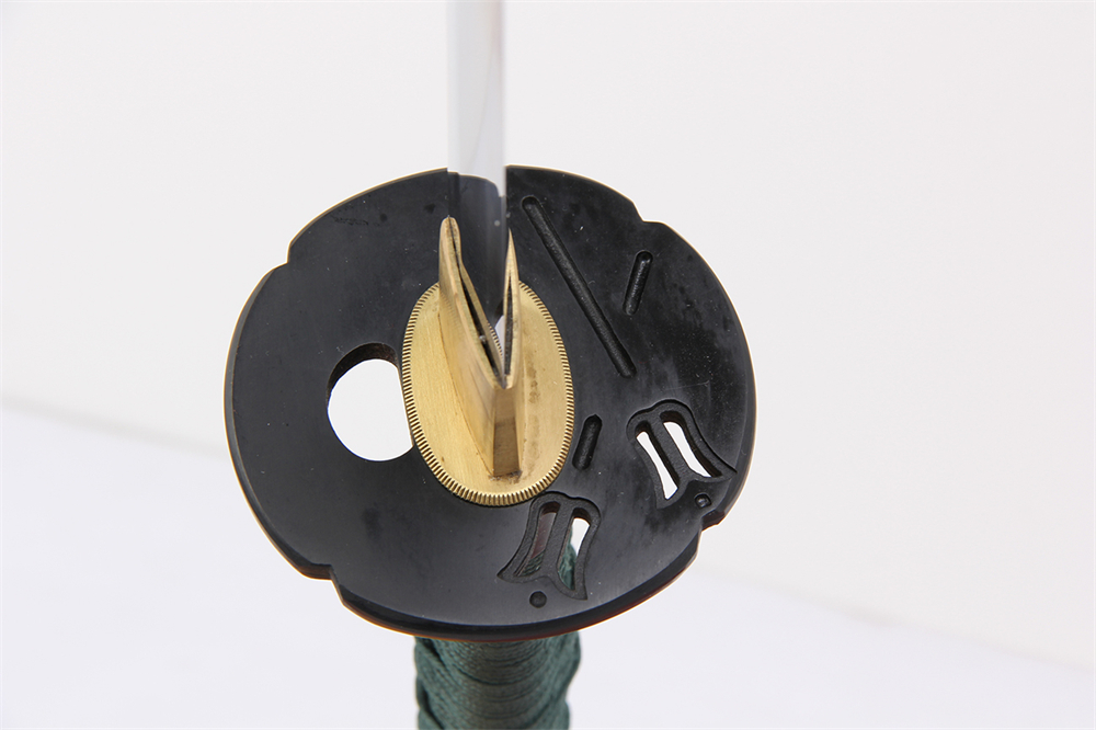 鞘材:實(shí)木深綠亮光漆貼銅花三個(gè)黃牛角 繞綠色真絲帶