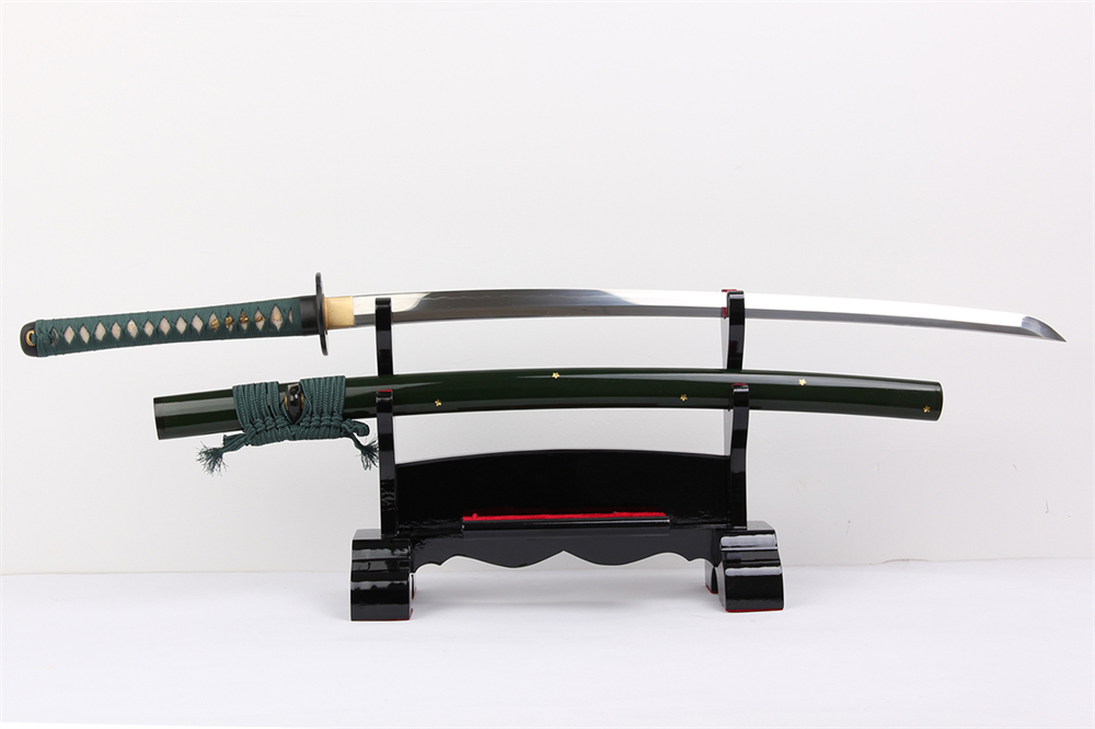 28寸高檔手工刀全長(zhǎng):104cm 刃長(zhǎng):68cm 柄長(zhǎng):28cm刃材:1095鋼燒刃無(wú)槽高檔磨三色大頭柄材:實(shí)木 繞綠色帶+真魚(yú)皮鞘材:實(shí)木深綠亮光漆貼銅花三個(gè)黃牛角 繞綠色真絲帶配件:銅包裝:梧桐木盒外加雙瓦紙盒裝 帶大盒玉刀油銅錘 黑色梅花真絲刀袋 西班牙式單層亮光刀架不印字貼紅布 黑說(shuō)明書(shū)
