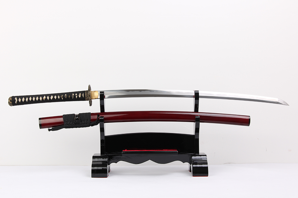 鞘材:實木半透明酒紅漆三個黑牛角 繞黑色真絲帶