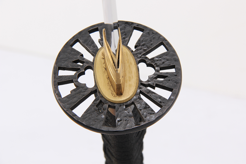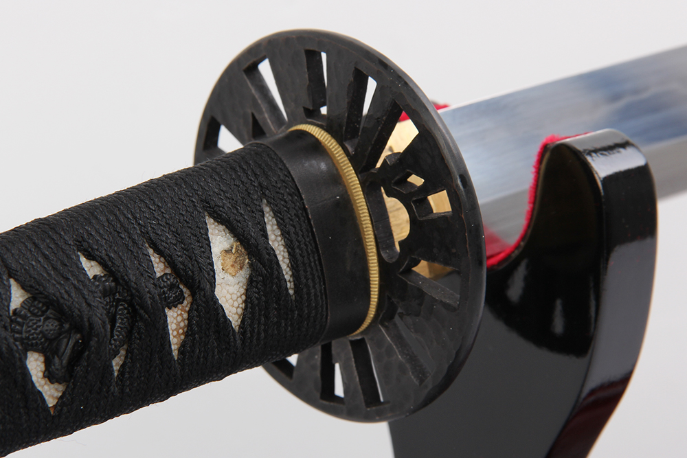 鞘材:實木半透明酒紅漆三個黑牛角 繞黑色真絲帶