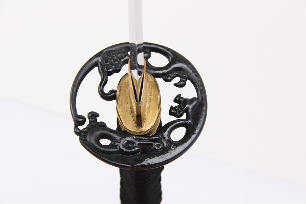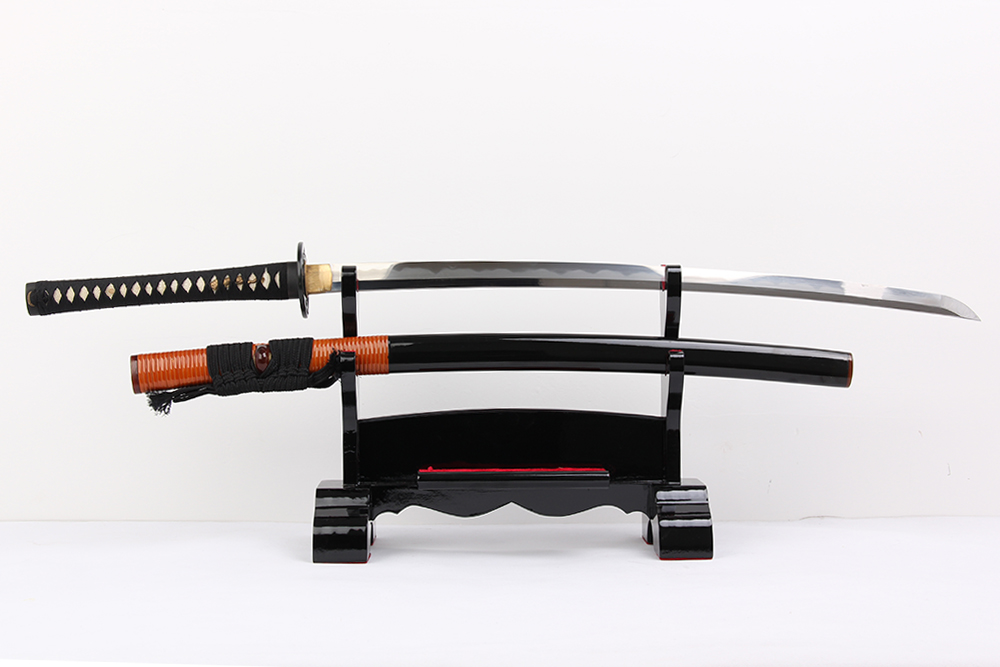 28寸高檔手工刀全長:104cm 刃長:68cm 柄長:28cm刃材:1095鋼燒刃無槽三色大頭柄材:實木 繞黑色帶+真魚皮鞘材:實木黑亮光漆繞黃藤三個黃牛角 繞黑色真絲帶配件:銅包裝:梧桐木盒外加雙瓦紙盒裝 帶盒裝玉刀油銅錘 黑色梅花真絲刀袋 西班牙單層亮光刀架不印字貼紅布 黑說明書