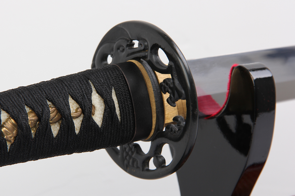 鞘材:實木黑亮光漆繞黃藤三個黃牛角 繞黑色真絲帶