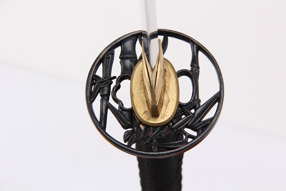 28寸高檔手工刀全長:104cm 刃長:68cm 柄長:28cm刃材:1095鋼燒刃無槽三色大頭柄材:實木 繞黑色帶+真魚皮鞘材:實木半透明酒紅漆鑲貝鴛鴦荷葉圖三個黑牛角 繞黑色真絲帶配件:銅包裝:梧桐木盒外加雙瓦紙盒裝 帶盒裝玉刀油銅錘 黑色梅花真絲刀袋 西班牙單層亮光刀架不印字貼紅布 黑說明書