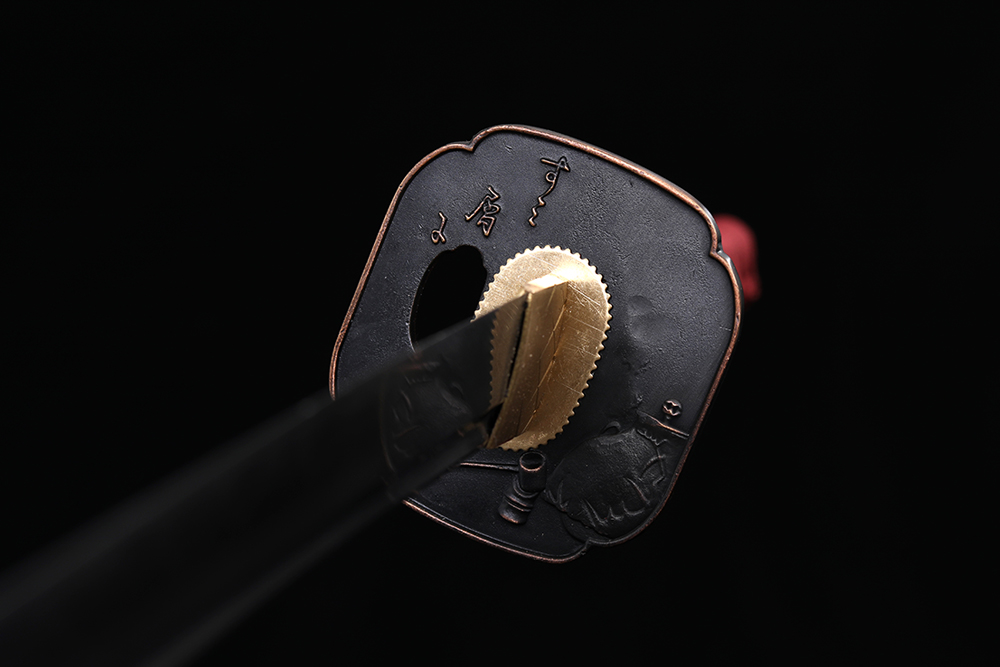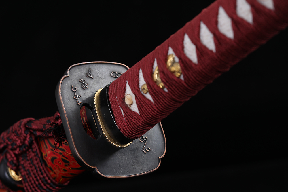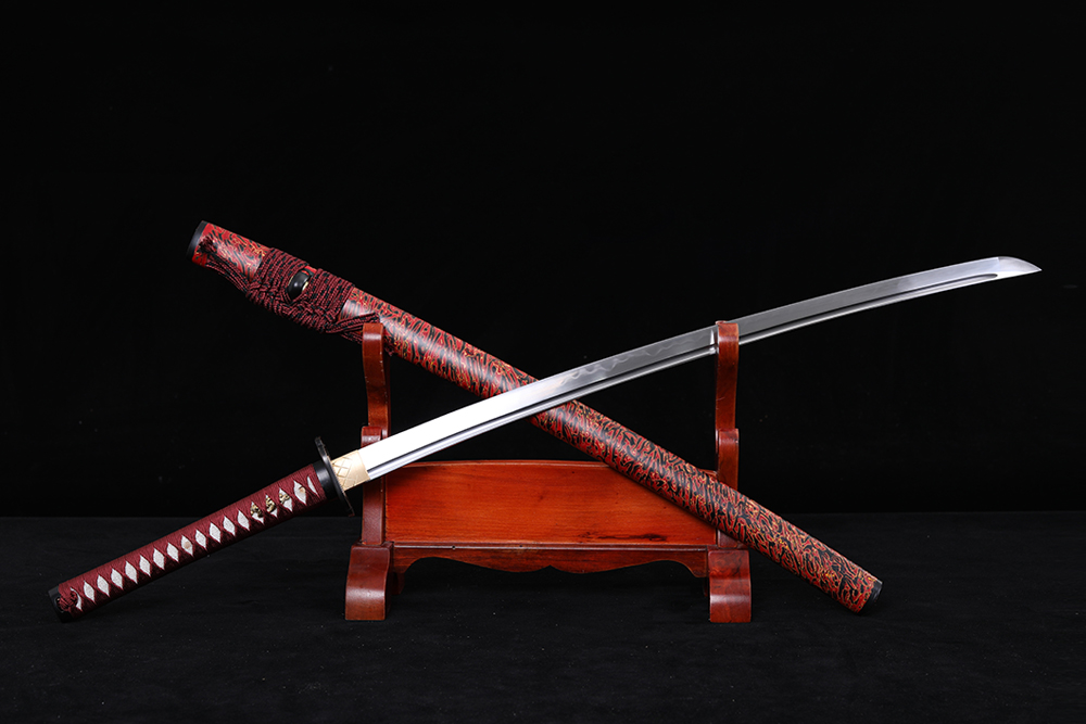28寸手工刀全長:104cm 刃長:68cm 柄長:28cm刃材:1045鋼燒刃全槽有切線柄材:實(shí)木 繞棗紅帶+真魚皮鞘材:實(shí)木紅黑金三色水波紋三圈黑 繞棗紅間黑真絲帶配件:銅+鋅合金包裝:黑龍布木盒裝帶黑布袋