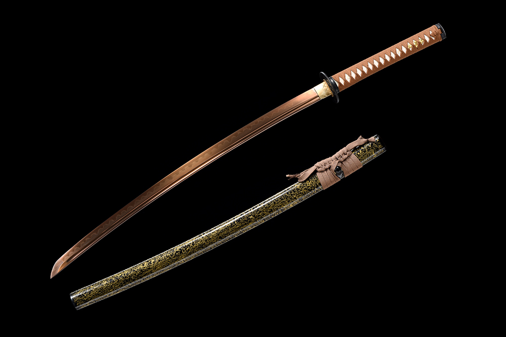 28寸手工刀全長:104cm 刃長:68cm 柄長:28cm刃材:1045鋼燒刃烤金色全槽有花口有切線柄材:實木 繞棕色帶+真魚皮鞘材:實木黑底金秀三圈黑 繞褐色羊毛帶配件:銅+鋅合金包裝:紙盒裝,帶黑布袋