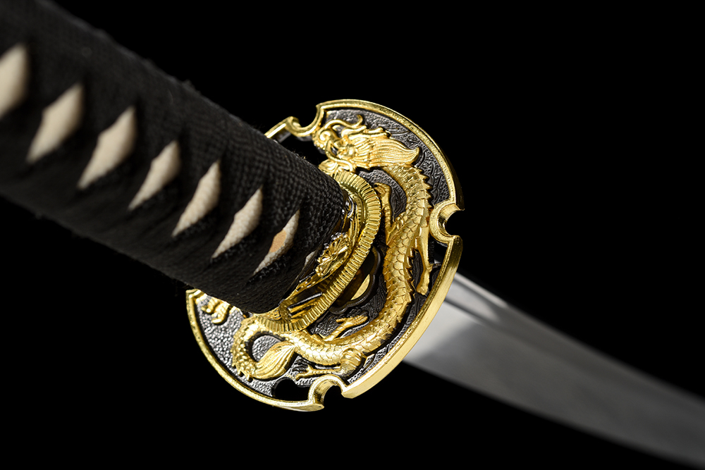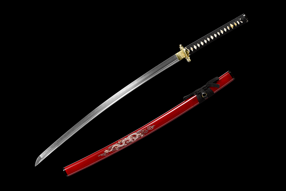 28寸手工刀全長:104cm 刃長:68cm 柄長:28cm刃材:1045鋼燒刃全槽有花口有切線柄材:實木 繞黑色帶+真魚皮鞘材:實木半透明酒紅三圈黑貼仿鑲貝回頭龍 繞黑色帶配件:銅+鋅合金包裝:黑彩盒帶黑布袋