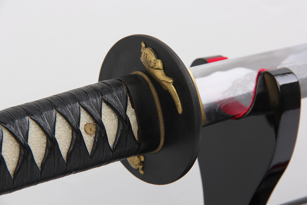 28寸手工刀全長(zhǎng):104cm 刃長(zhǎng):68cm 柄長(zhǎng):28cm刃材:不銹鋼熱處理 反面開雙槽正面手工爛龍柄材:實(shí)木 繞黑豬皮+真魚皮鞘材:實(shí)木黑亮光漆 繞黑色帶配件:銅+鋅合金包裝:紅龍布盒裝外加雙瓦紙內(nèi)盒 帶黃龍布袋