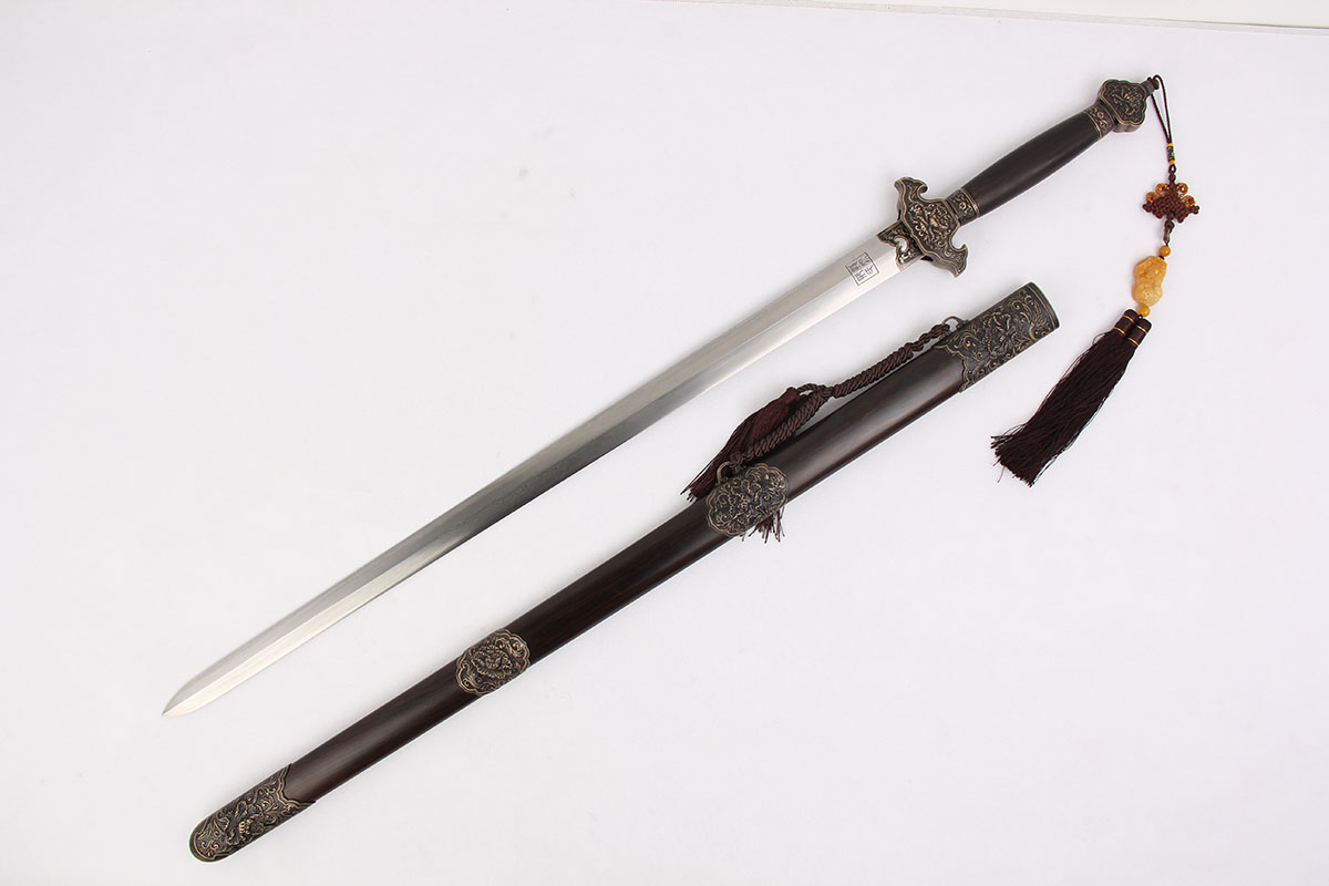 全長:103CM 刃長:77CM 柄長:21CM 劍身: 花紋鋼刀鞘:黑檀木裝具:銅包裝:木錦盒