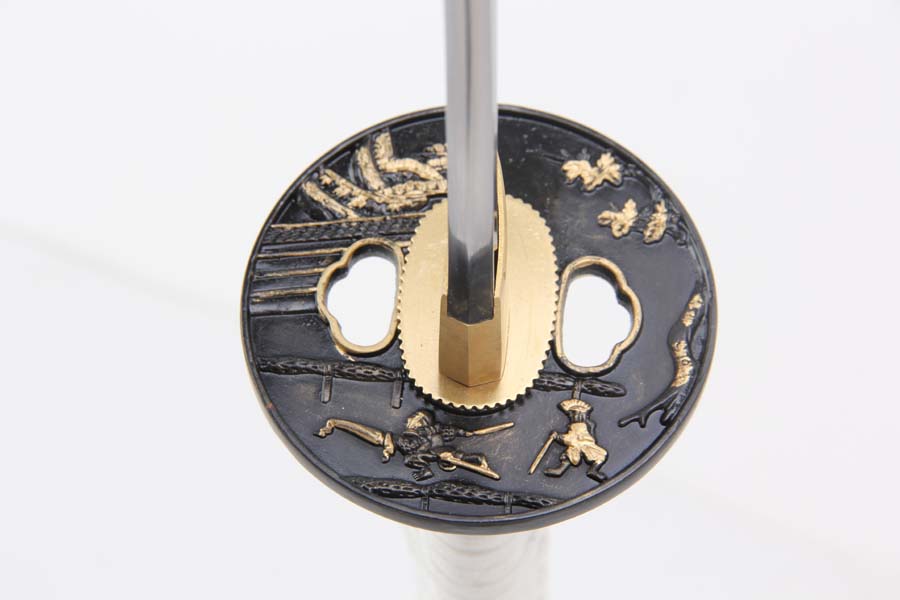 28寸手工刀全長:104cm 刃長:68cm 柄長:28cm刃材:1045鋼無槽有花口 腹刀不銹鋼柄材:實木 繞白色帶+真魚皮鞘材:實木黑亮光帶腹刀插槽 繞黑色帶配件:銅+鋅合金包裝:黑彩盒裝 帶黑布袋