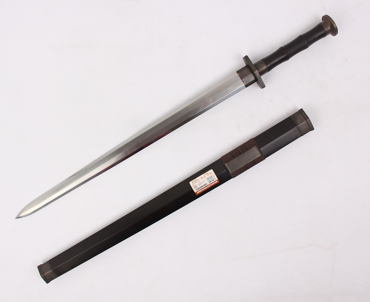 全長: 75CM 刃長: 54CM 柄長:15CM 劍身: 百煉花紋鋼刀鞘:二級(jí)黑檀木裝具:銅黑包裝:錦盒