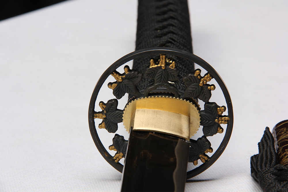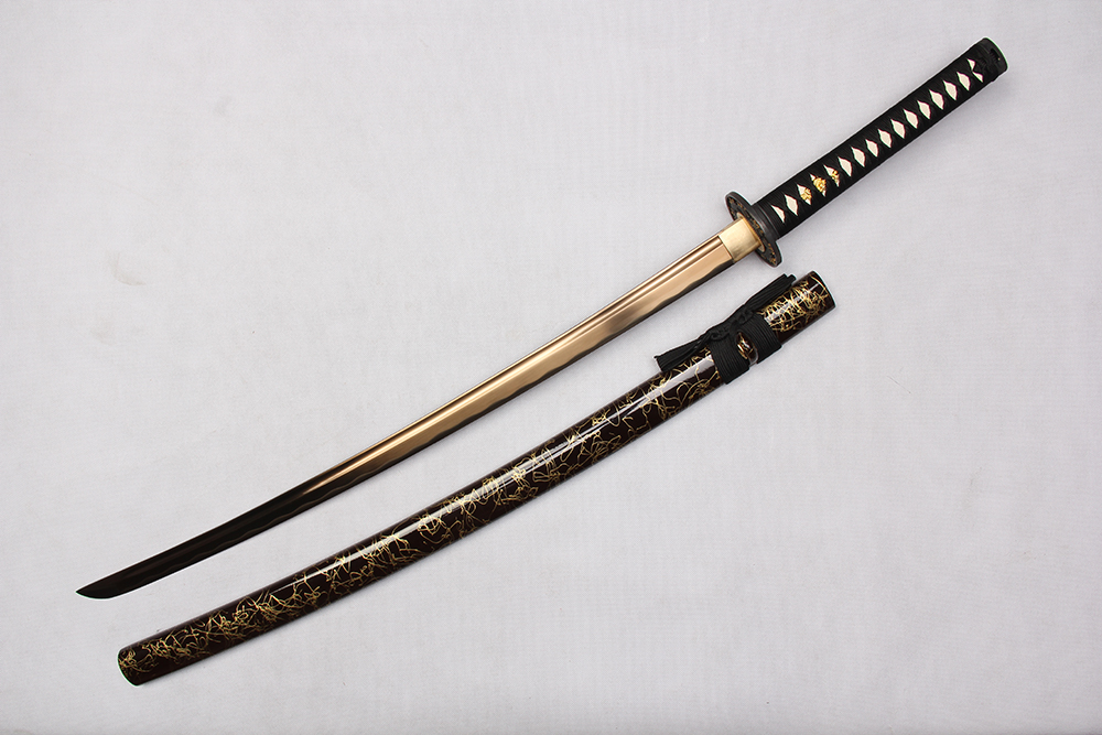 28寸手工刀全長(zhǎng):104cm 刃長(zhǎng):68cm 柄長(zhǎng):28cm刃材:1045鋼有槽電鍍金色有花口有切線柄材:實(shí)木 繞黑色帶+仿魚皮鞘材:實(shí)木深咖色拉金絲 繞黑色帶配件:鋅合金包裝:雙瓦紙盒 帶黑布袋