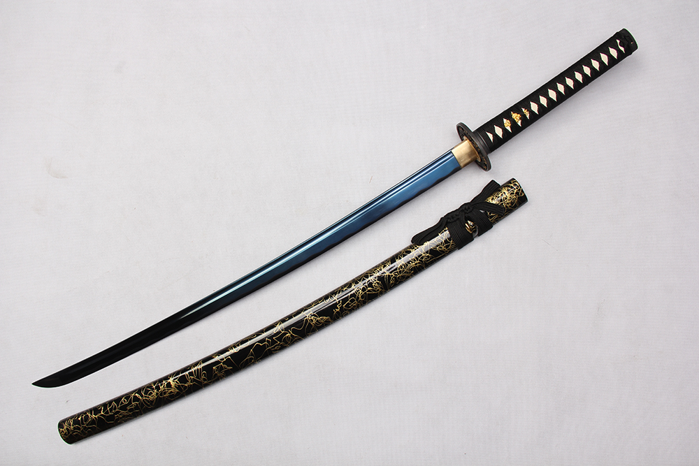 28寸手工刀全長(zhǎng):104cm 刃長(zhǎng):68cm 柄長(zhǎng):28cm刃材:1045鋼有槽電鍍藍(lán)色有花口 有切線柄材:實(shí)木 繞黑色帶+仿魚(yú)皮鞘材:實(shí)木黑亮光拉金絲 繞黑色帶配件:鋅合金包裝:雙瓦紙盒 帶黑布袋