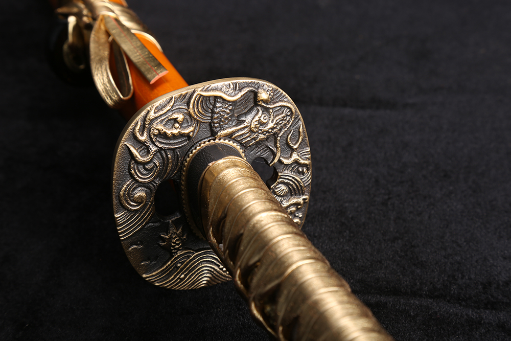 28寸手工刀全長:104cm 刃長:68cm 柄長:28cm刃材:百煉花紋鋼全槽電鍍金黃色有花口有切線柄材:實(shí)木 繞金色假皮+真魚皮鞘材:實(shí)木閃光金黃鞘三圈黑 繞金色假皮配件:銅包裝:彩盒裝 帶黑布袋