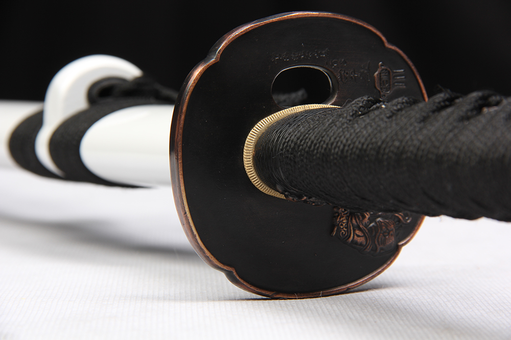 28寸手工刀全長:104cm 刃長:68cm 柄長:28cm刃材:1045鋼低燒刃有槽有切線柄材:實木 繞黑色帶+仿魚皮鞘材:實木白亮光漆 繞黑色帶配件:銅+鋅合金包裝:彩盒裝 帶黑布袋