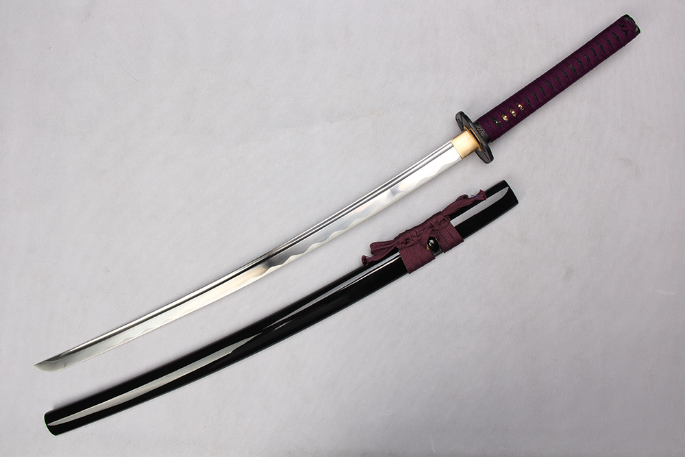 28寸手工刀全長:104cm 刃長:68cm 柄長:28cm刃材:1060鋼開槽有花口有切線柄材:實木 繞紫色帶+仿魚皮鞘材:實木黑亮光漆 繞淡紫色羊毛帶配件:銅包裝:彩盒裝 帶黑布袋