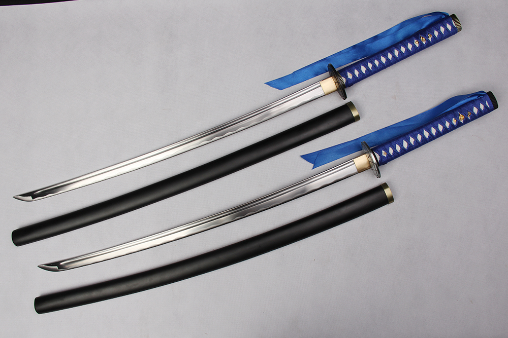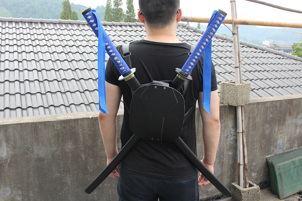 28寸忍者神龜雙刀 手工刀全長:104cm 刃長:68cm 柄長:28cm刃材:1045鋼有槽有花口有切線柄材:實木 繞寶藍(lán)帶+仿魚皮(系寶藍(lán)飄帶)鞘材:實木亞光黑漆 繞寶藍(lán)帶配件:鋅合金包裝:雙瓦紙盒