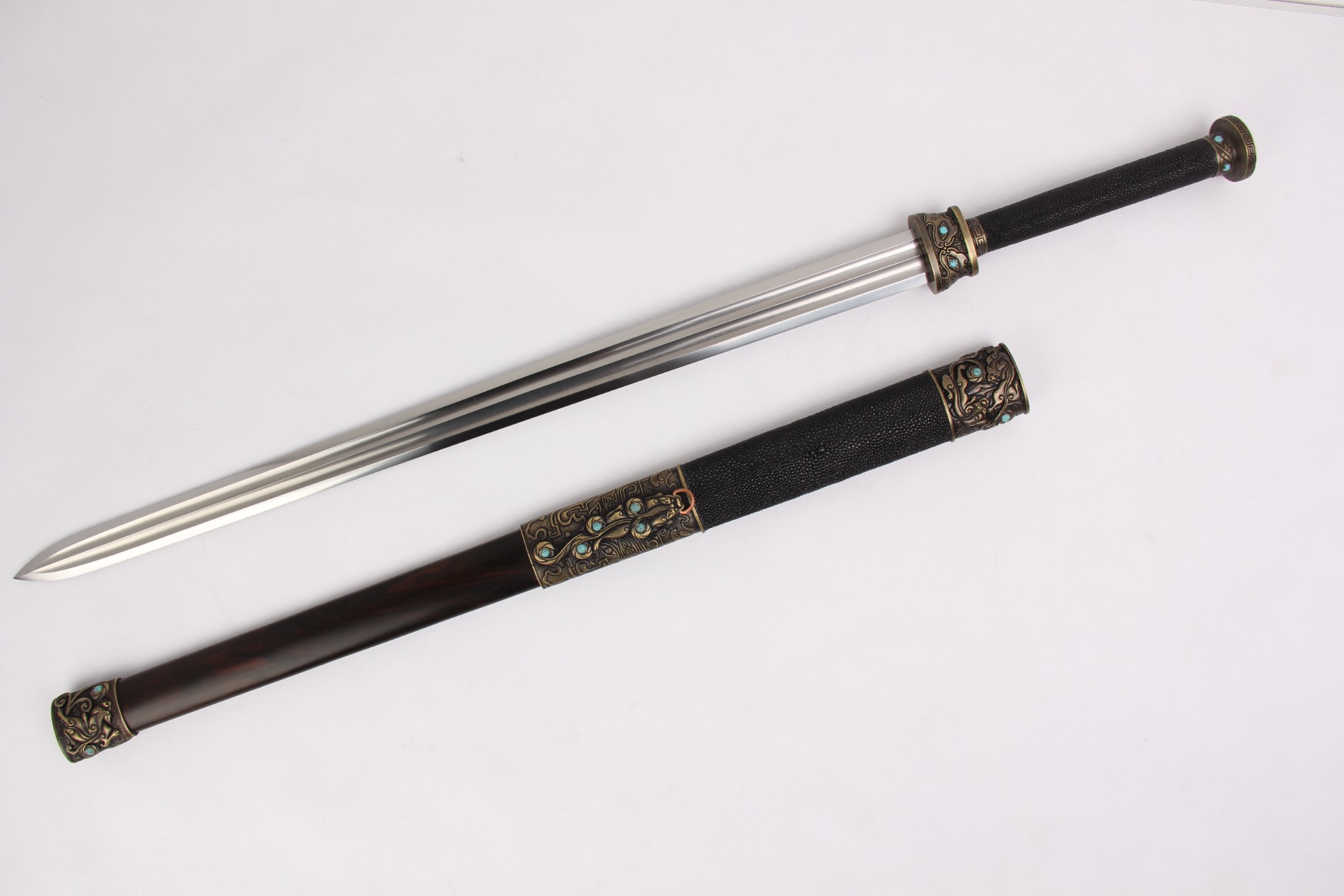 全長(zhǎng):92CM 刃長(zhǎng):65CM 柄長(zhǎng):24CM 劍身: 百煉花紋鋼刀鞘:黑檀木 黑色鯊魚皮裝具:銅包裝:木錦盒