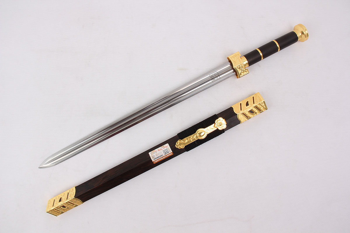 全長: 75CM 刃長: 54CM 柄長:15CM 劍身: 百煉花紋鋼八面開雙槽刀鞘:黑檀木裝具:銅沙金包裝:錦盒