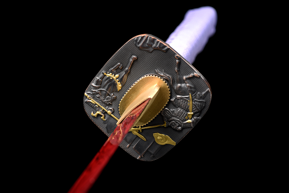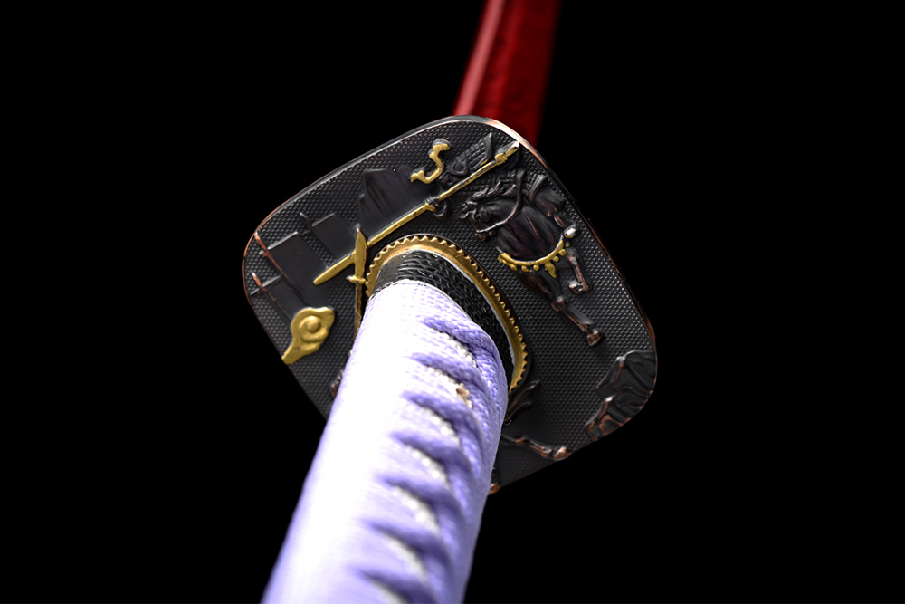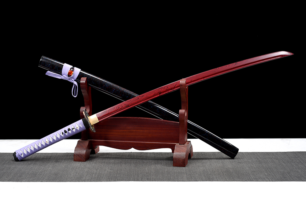 28寸手工刀全長:104cm 刃長:68cm 柄長:28cm刃材:1045鋼有槽 紅色木紋油漆柄材:實(shí)木 繞淡紫帶+仿魚皮鞘材:實(shí)木黑底拉藍(lán)紅絲水晶鼻 繞淡紫帶配件:銅+鋅合金包裝:雙瓦紙盒 帶黑布袋