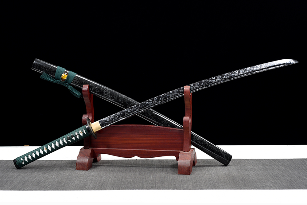 28寸手工刀全長:104cm 刃長:68cm 柄長:28cm刃材:1045鋼有槽 黑底白花紋油漆柄材:實木 繞綠色帶+仿魚皮鞘材:實木黑色拉銀絲水晶鼻 繞綠色帶配件:銅+鋅合金包裝:雙瓦紙盒 帶黑布袋